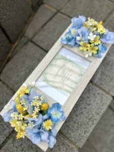 アーティフィシャルフラワーのカラーは、水色と黄色のお花をリクエストしていただきました。