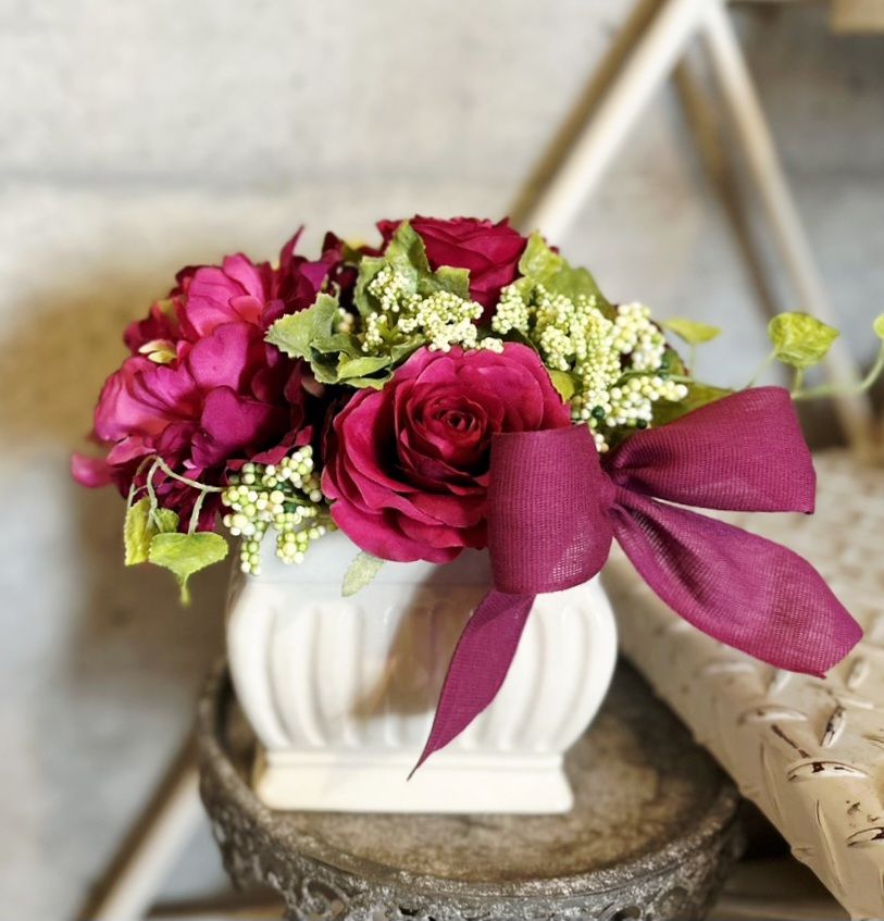お祝いには、彼女の好きな色である濃いピンクのアーティフィシャルフラワーを、彼のリクエストでプレゼントさせていただきました。