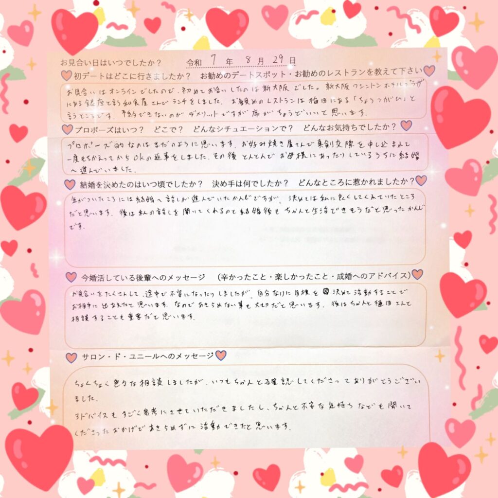 譲れない条件はしっかり守りつつ、それ以外は柔軟に考え、いつも前向きな気持ちでお見合いに臨まれていました。