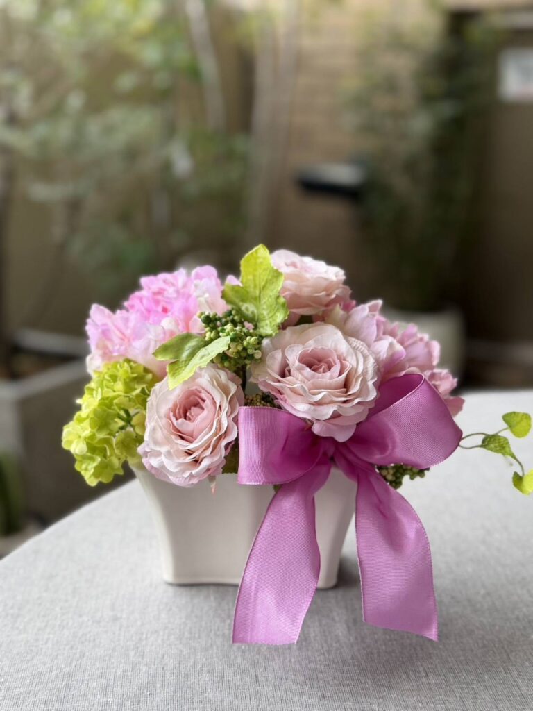 お祝いには彼女のリクエストのピンクのバラのアーティフィシャルフラワーにさせていただきました。
