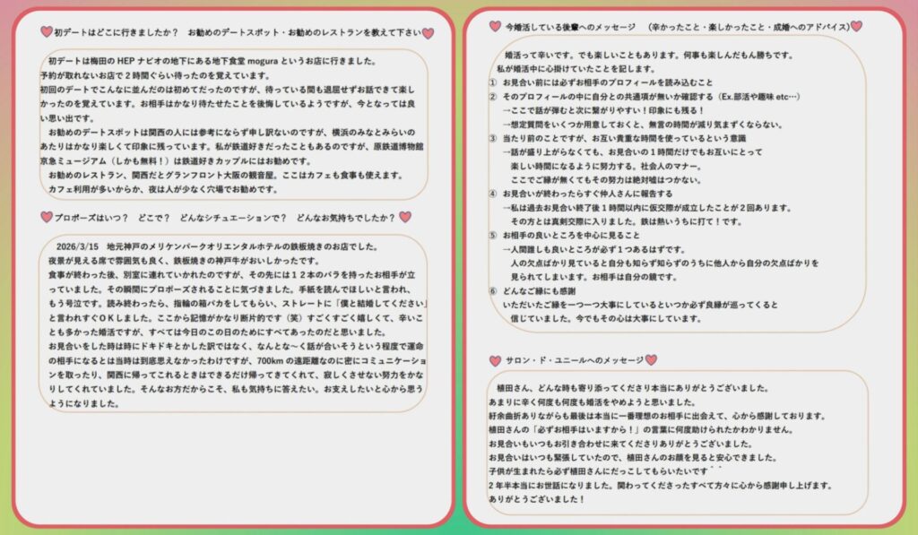 彼女から、婚活を頑張る後輩へのメッセージでは、ご自身の経験を踏まえたアドバイスをたくさんいただきました。