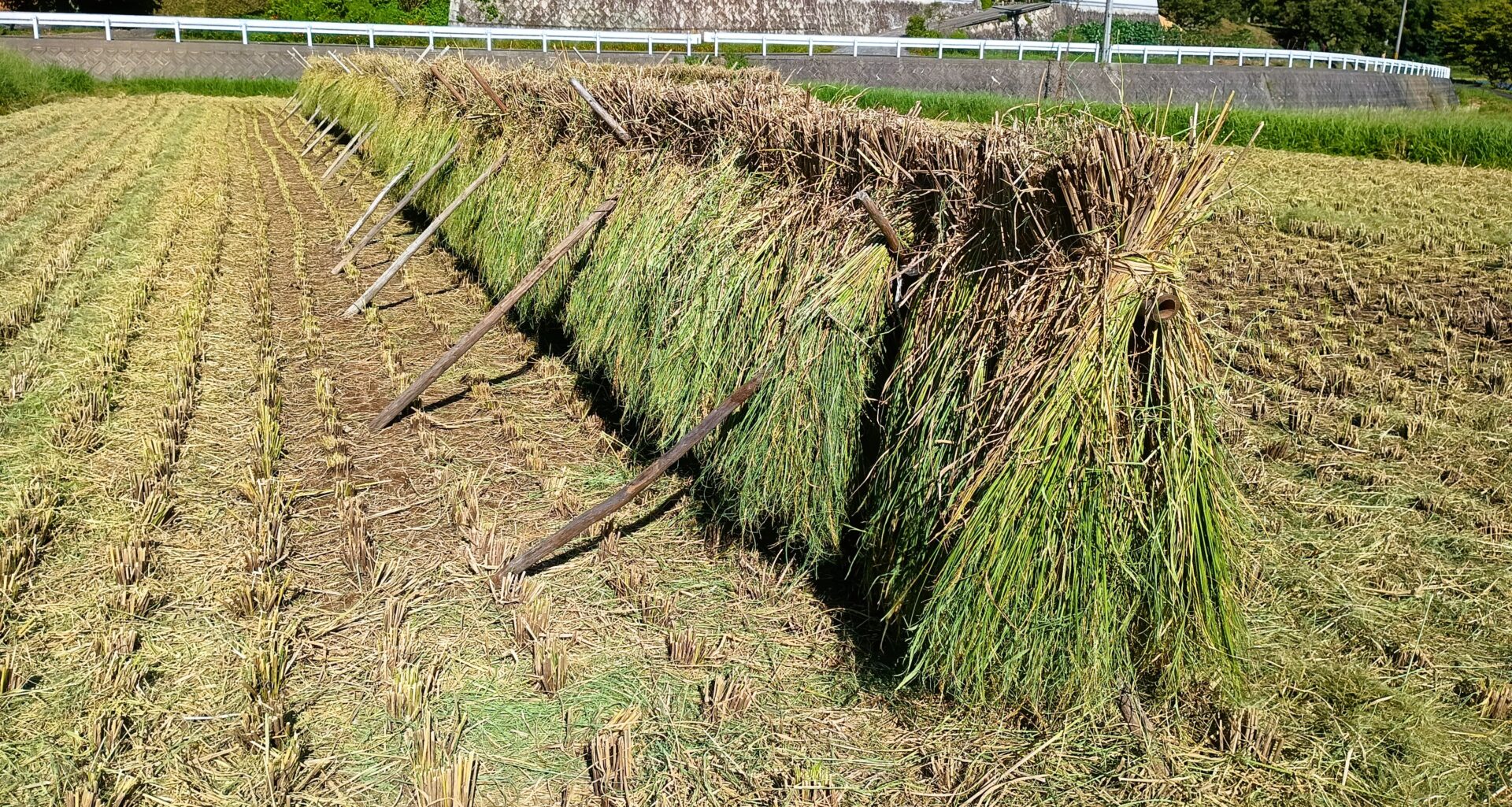 最近は機械化が進みこの工程は必要なくなったのですが、藁をとる為にあえて稲木干しをします。