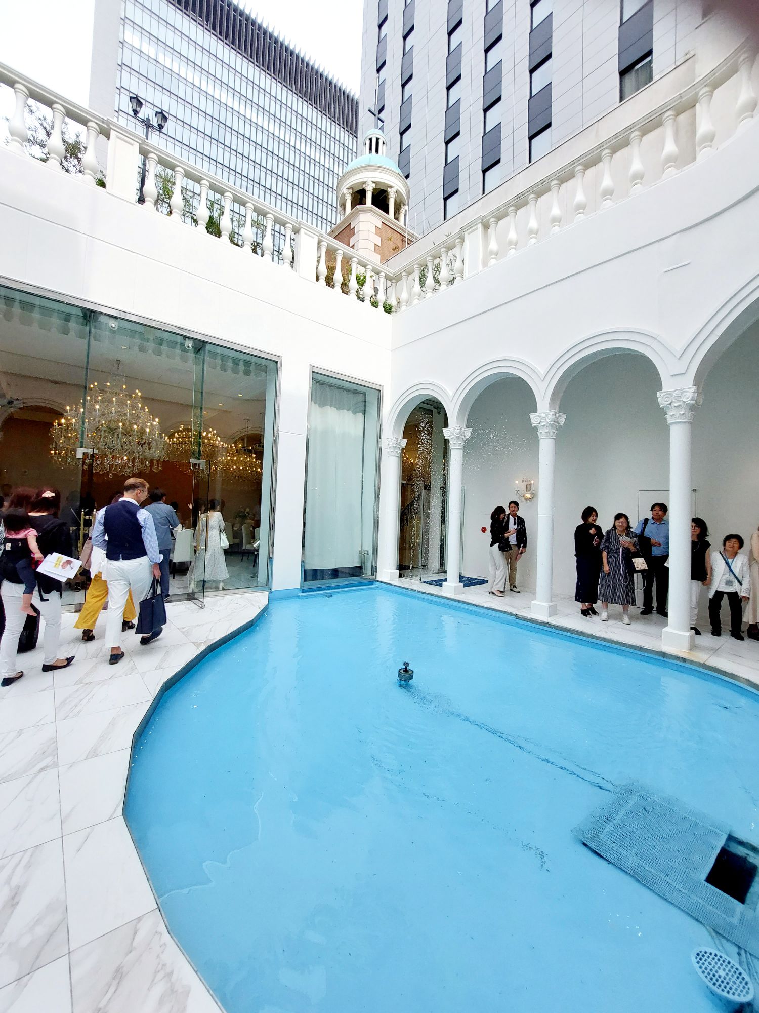 披露宴会場のシャンデリア、水の見えるプライベートガーデンも海外ウェディングのようで、