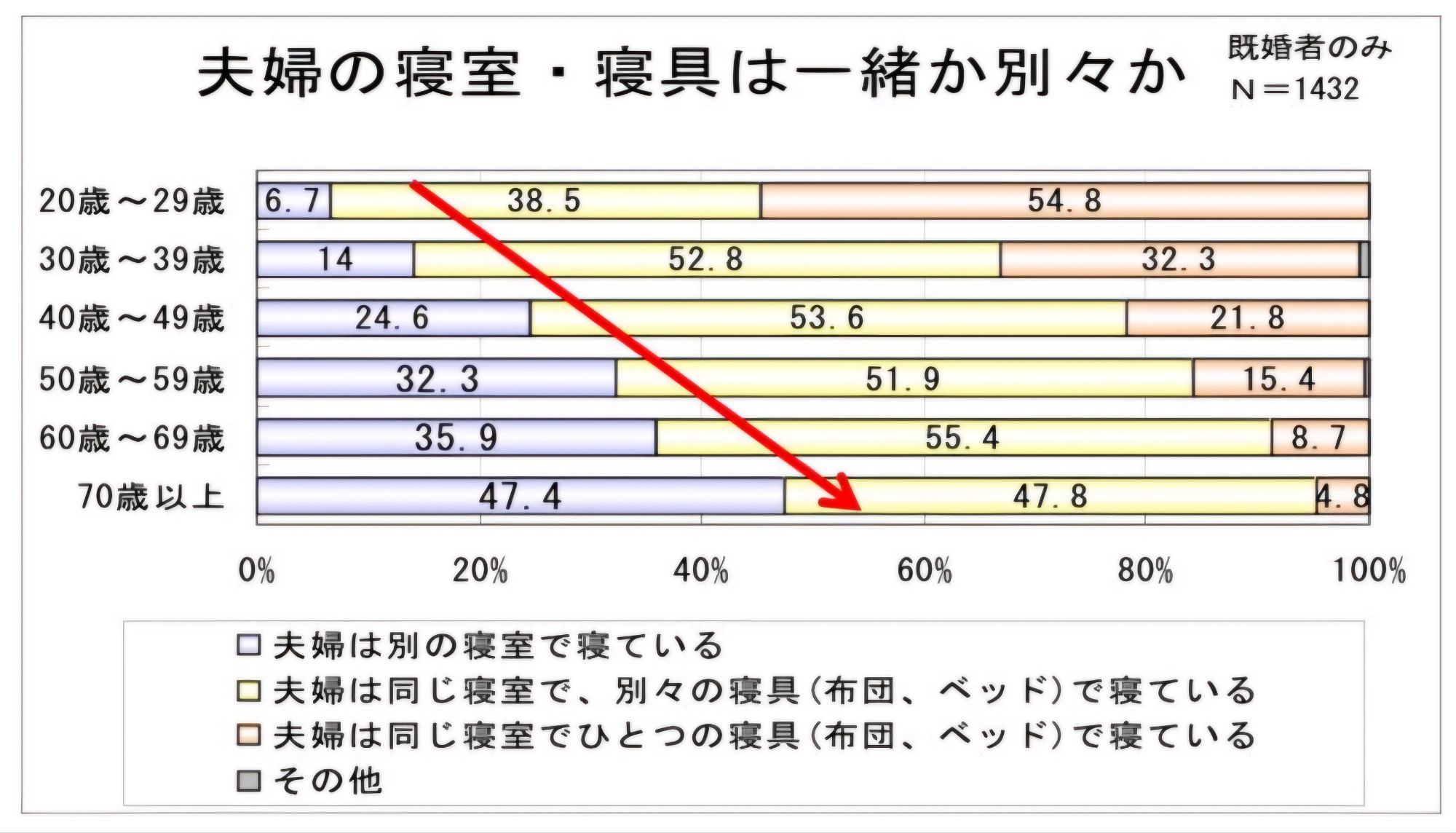 紫色の帯が夫婦別室ですが、年が上がるにつれて増えていき、50代では3組に1組が別室で寝ているようです。