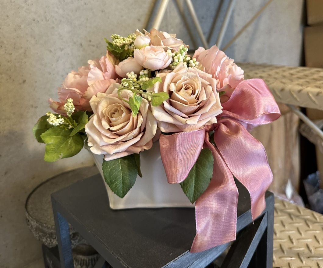 お祝いにはピンクのバラのアーティフィシャルフラワーにさせていただきました。