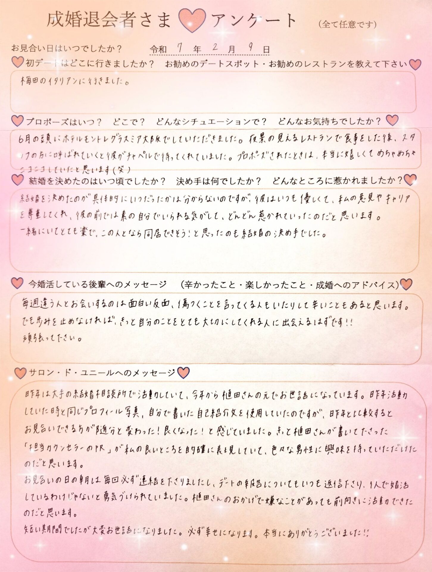 「お見合いの朝は毎回必ず連絡をくださりましたし、デートの報告についてもいつも返信を下さり、一人で婚活をしているわけじゃないと勇気づけられました。植田さんのおかげで嫌なことがあっても前向きに活動できたのだと思います。」