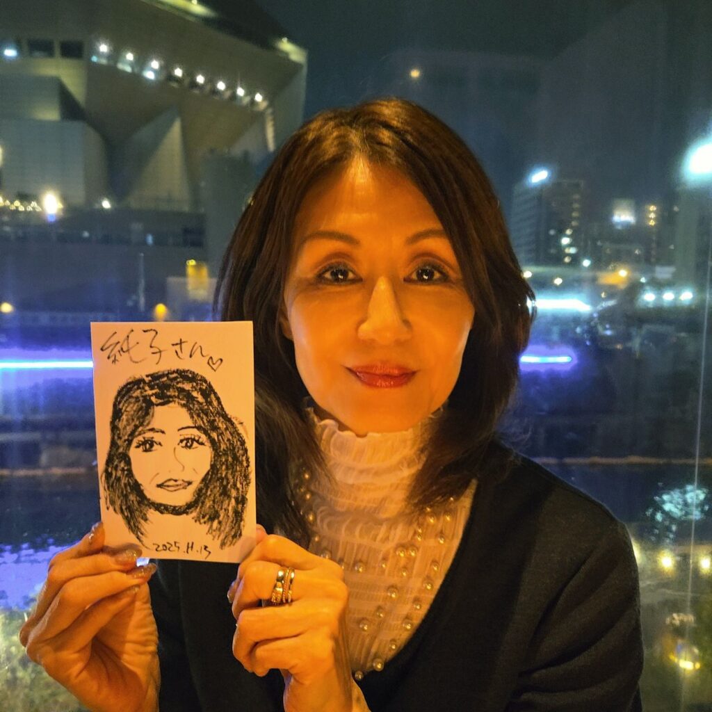ご紹介者のさおりさんは、似顔絵を筆ペンでささっと描かれる絵の才能をいかして、いつかお仕事にしたいとのこと!